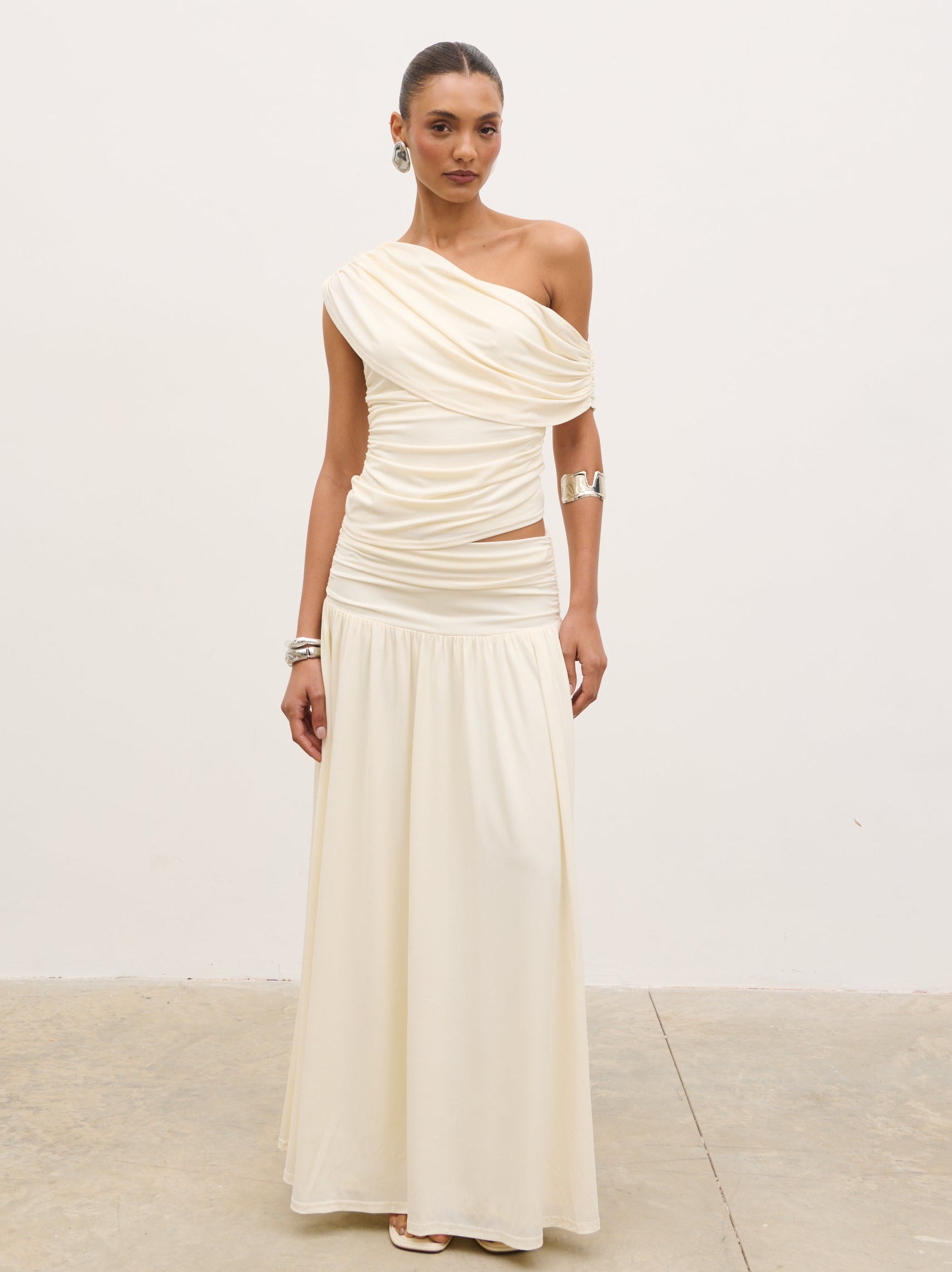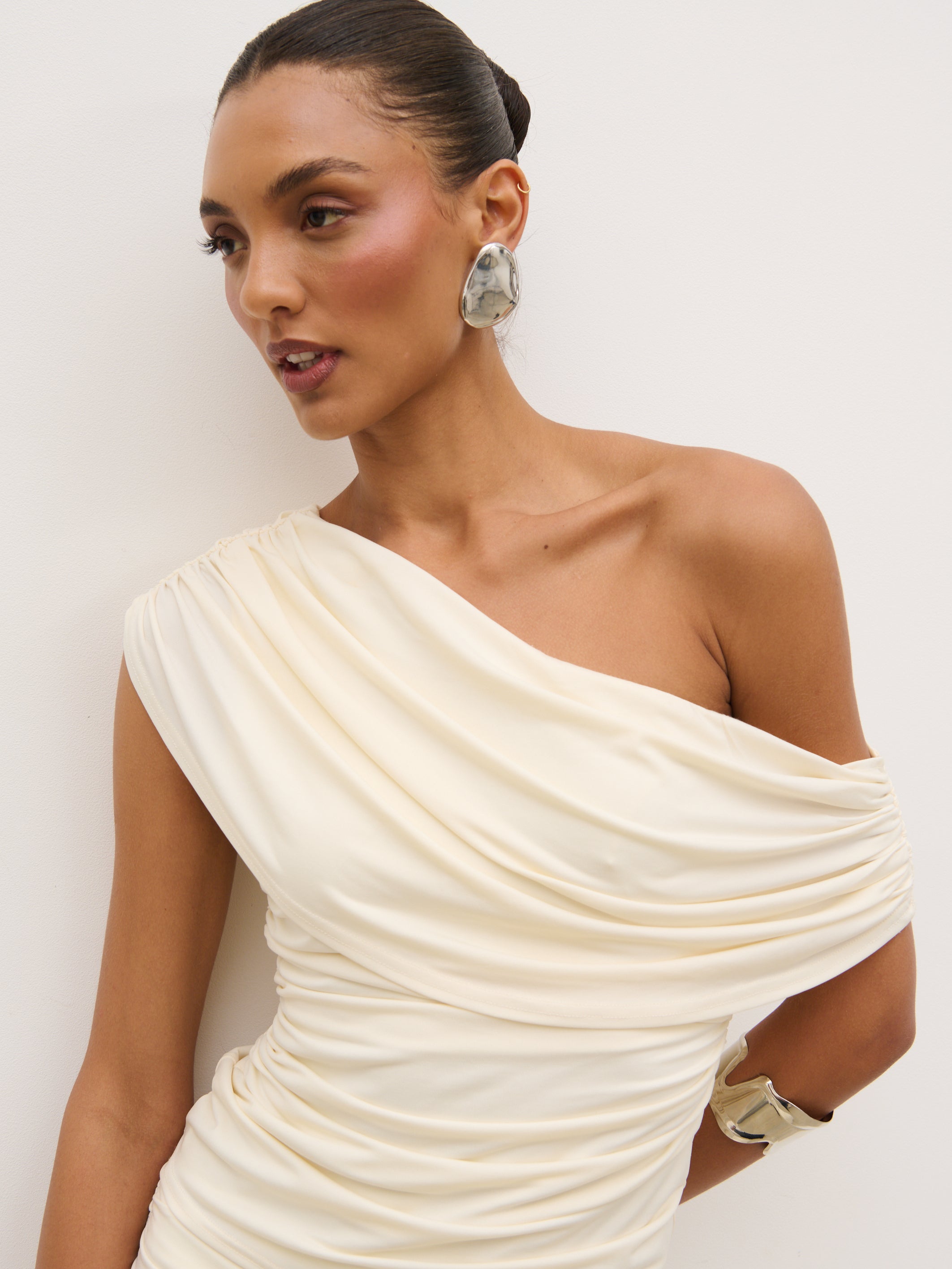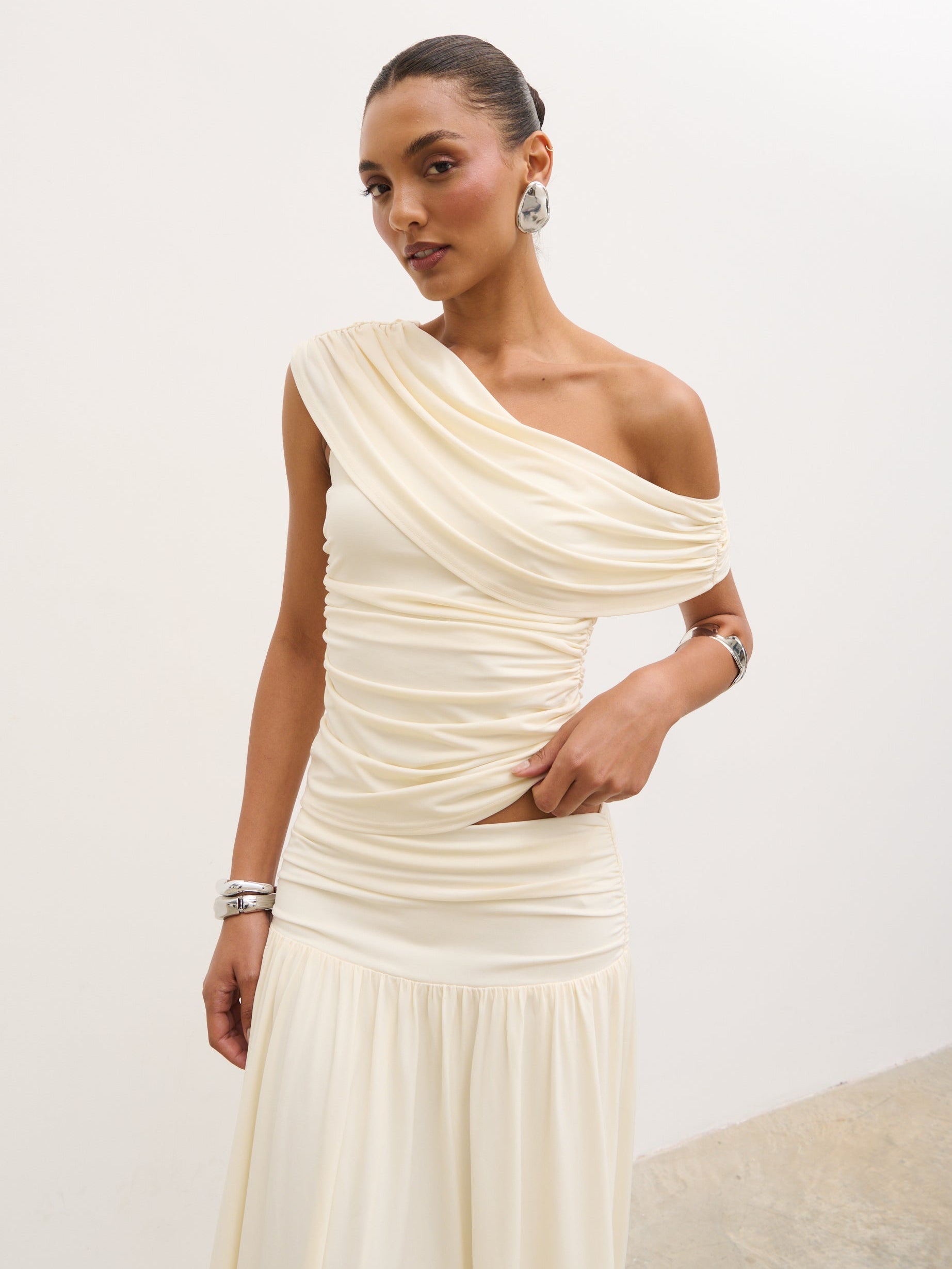 Designed for modern, sculpted styling, the Lydia Ruched Jersey Top blends soft structure with effortless elegance. Cut in a flattering one-shoulder silhouette, it features fluid draping across the neckline and delicate ruching through the body for a contoured fit.