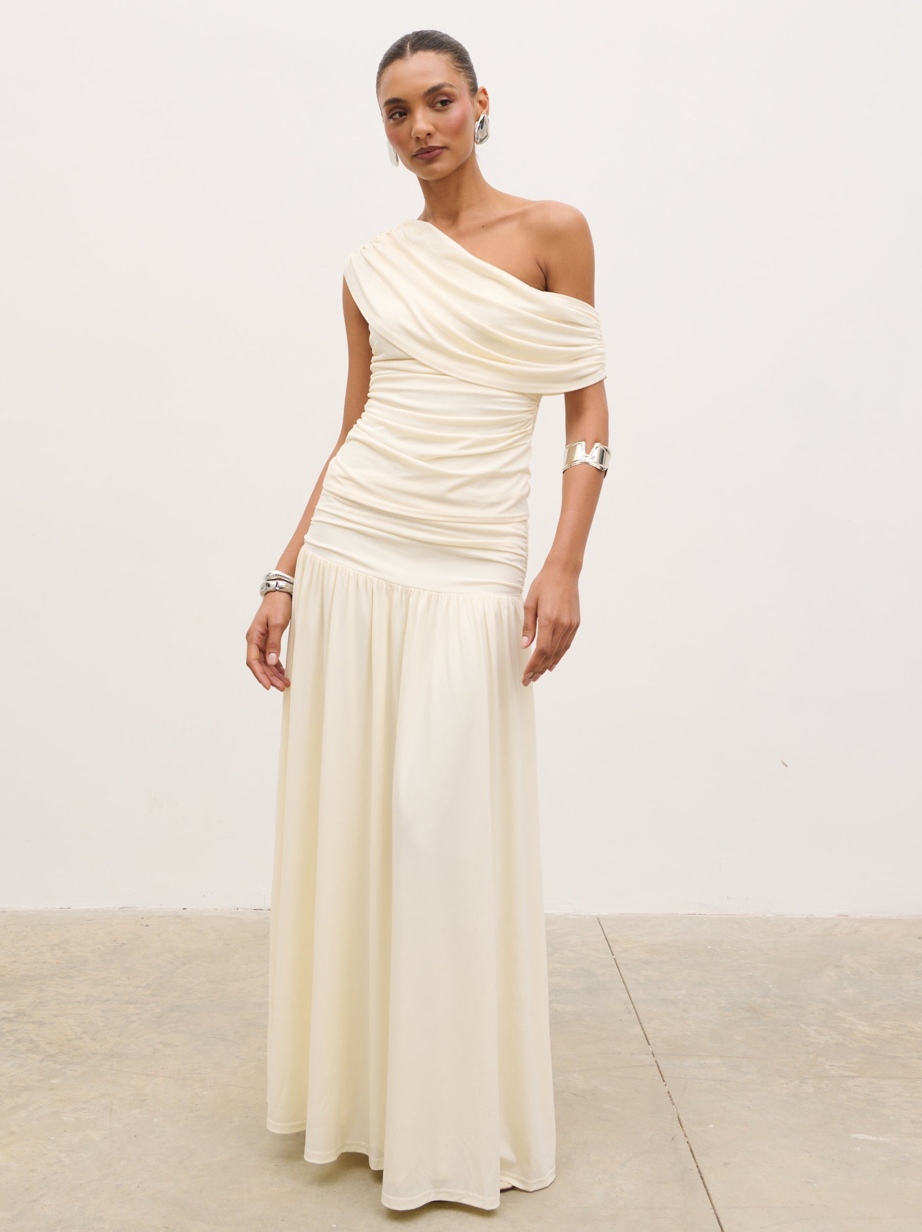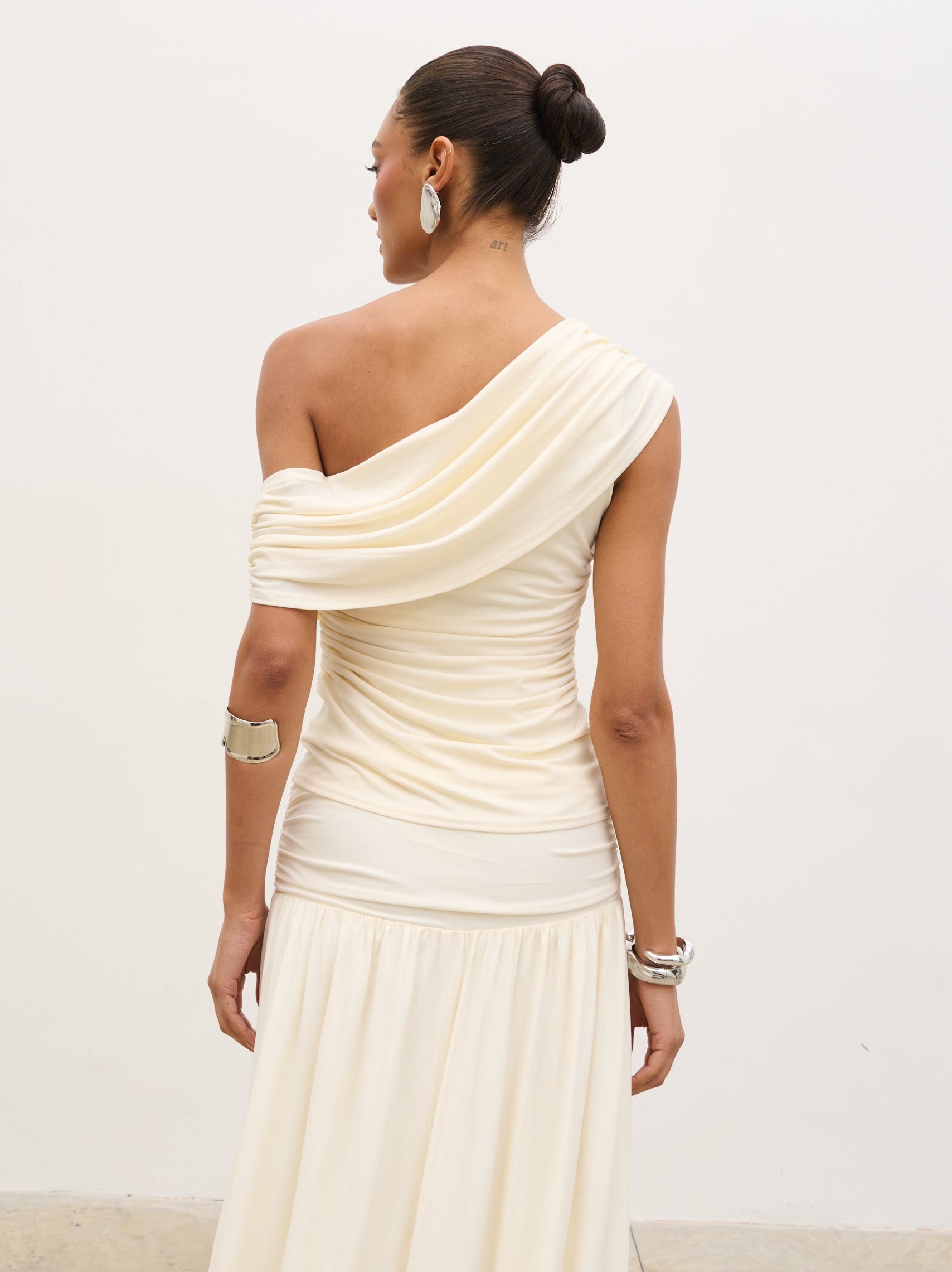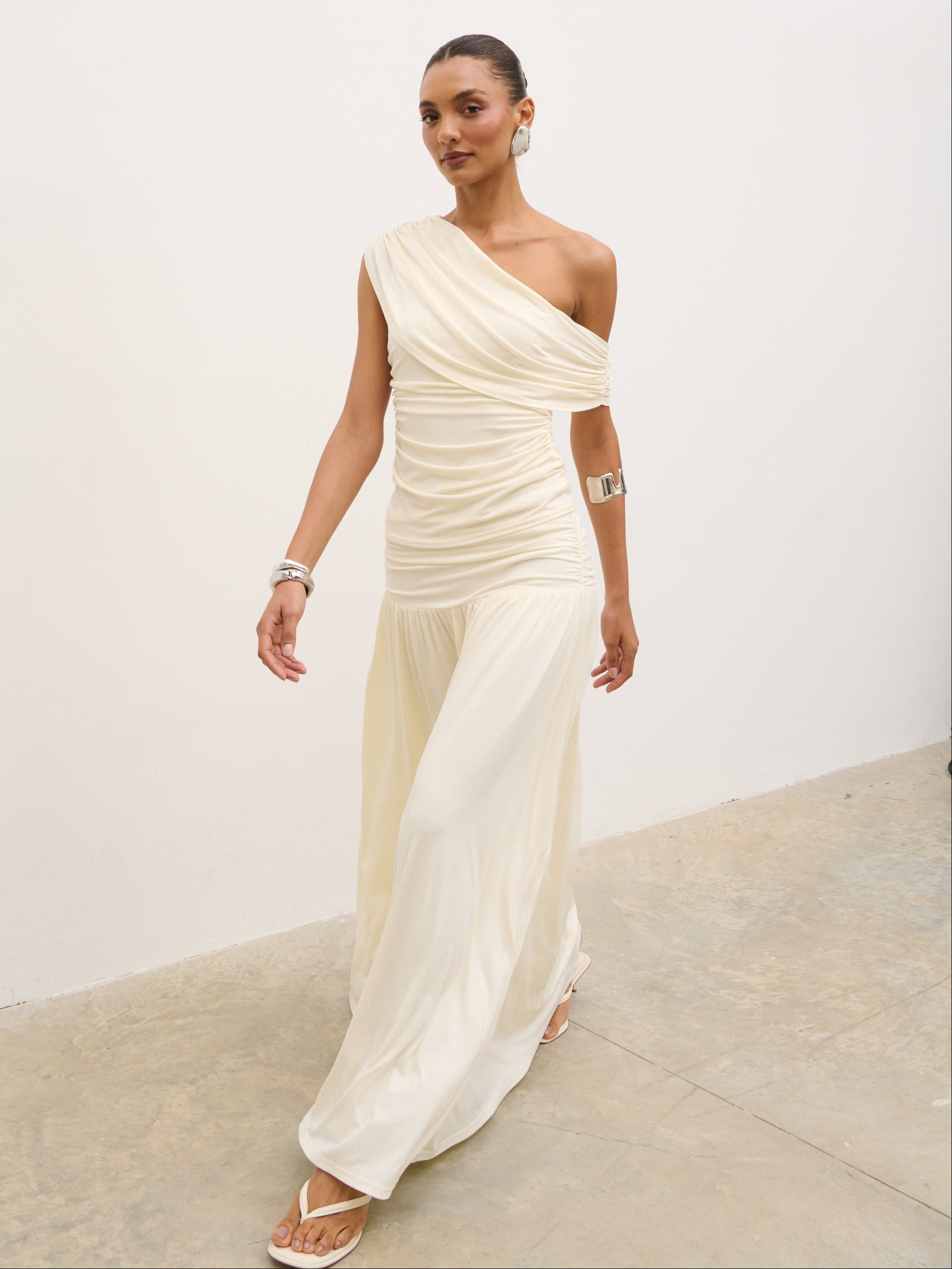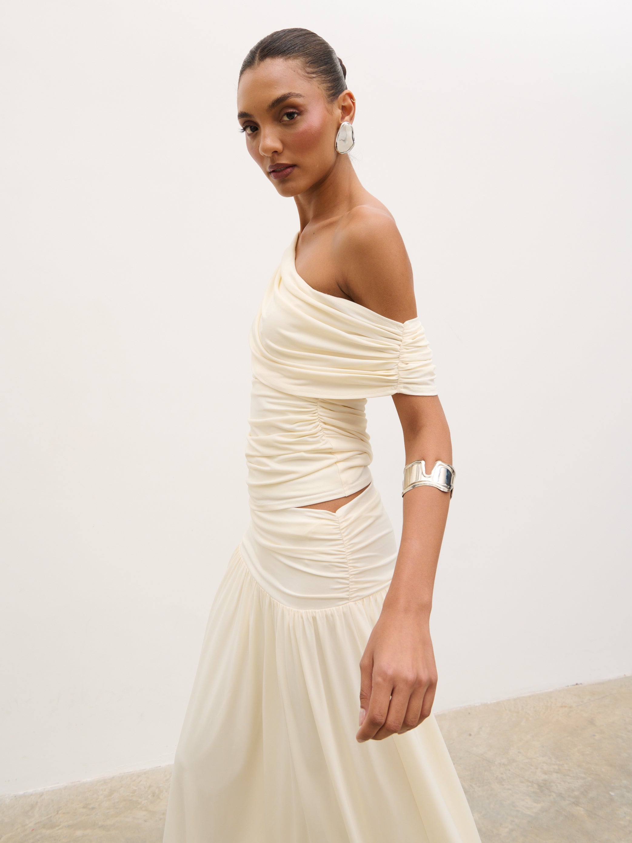 Designed for modern, sculpted styling, the Lydia Ruched Jersey Top blends soft structure with effortless elegance. Cut in a flattering one-shoulder silhouette, it features fluid draping across the neckline and delicate ruching through the body for a contoured fit.
