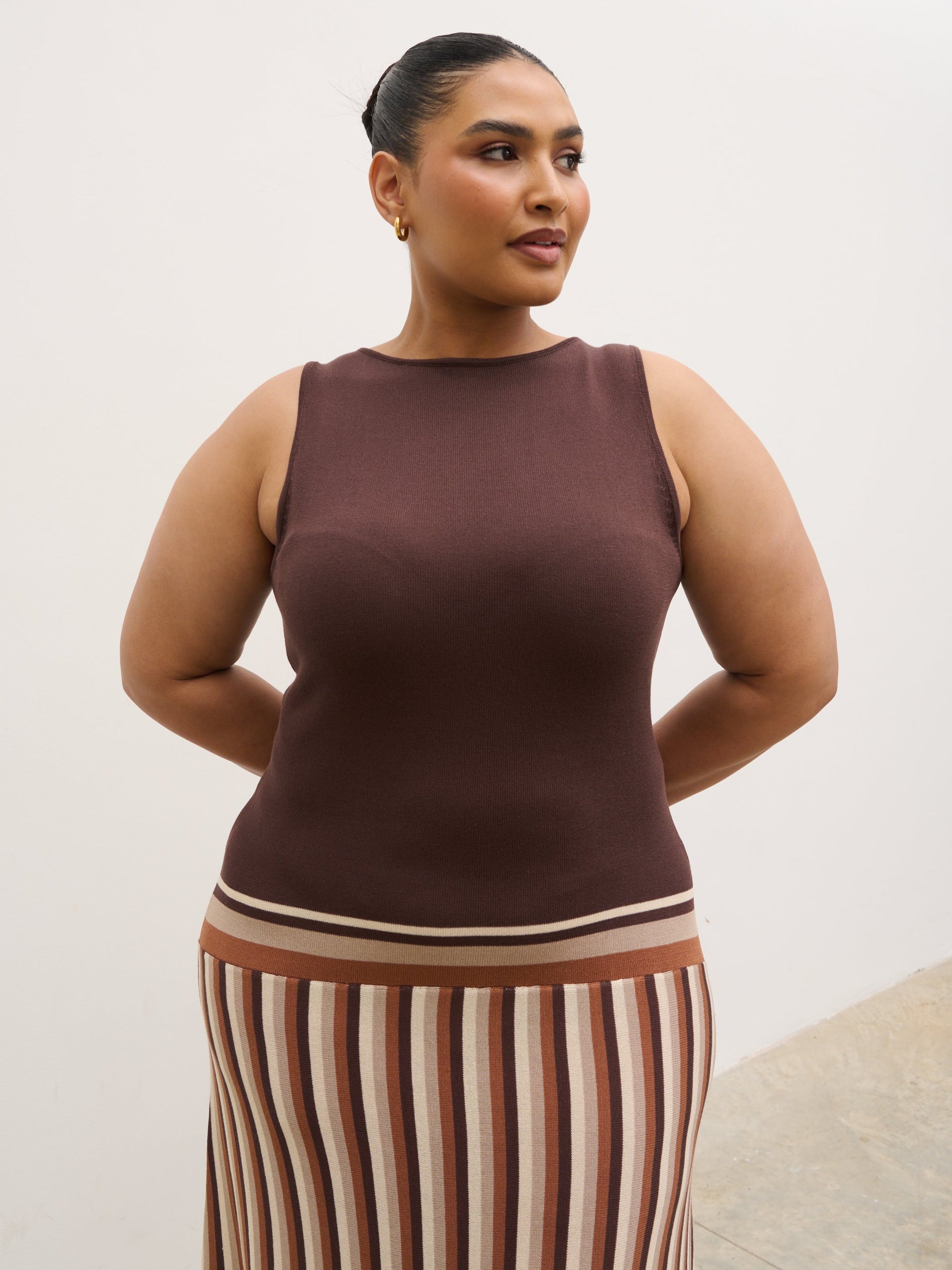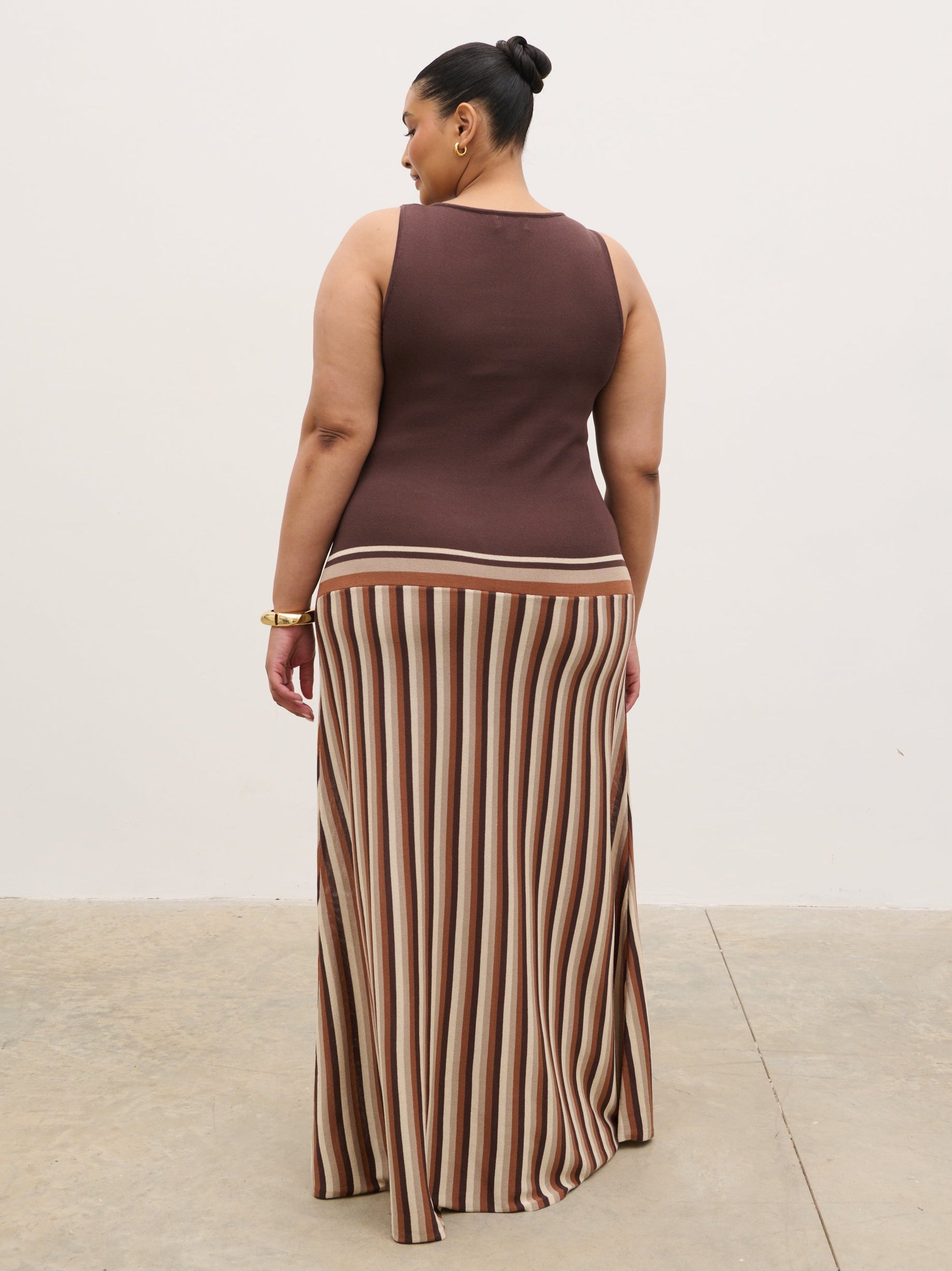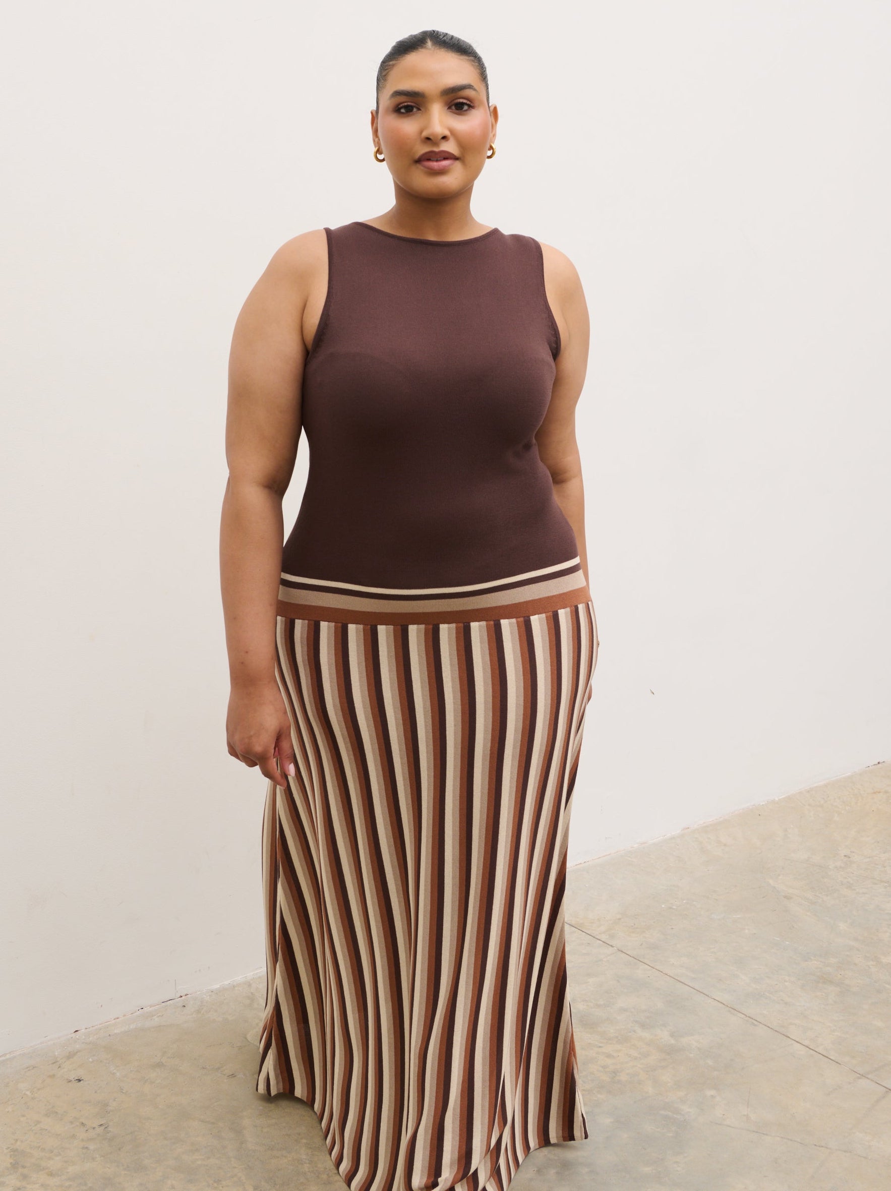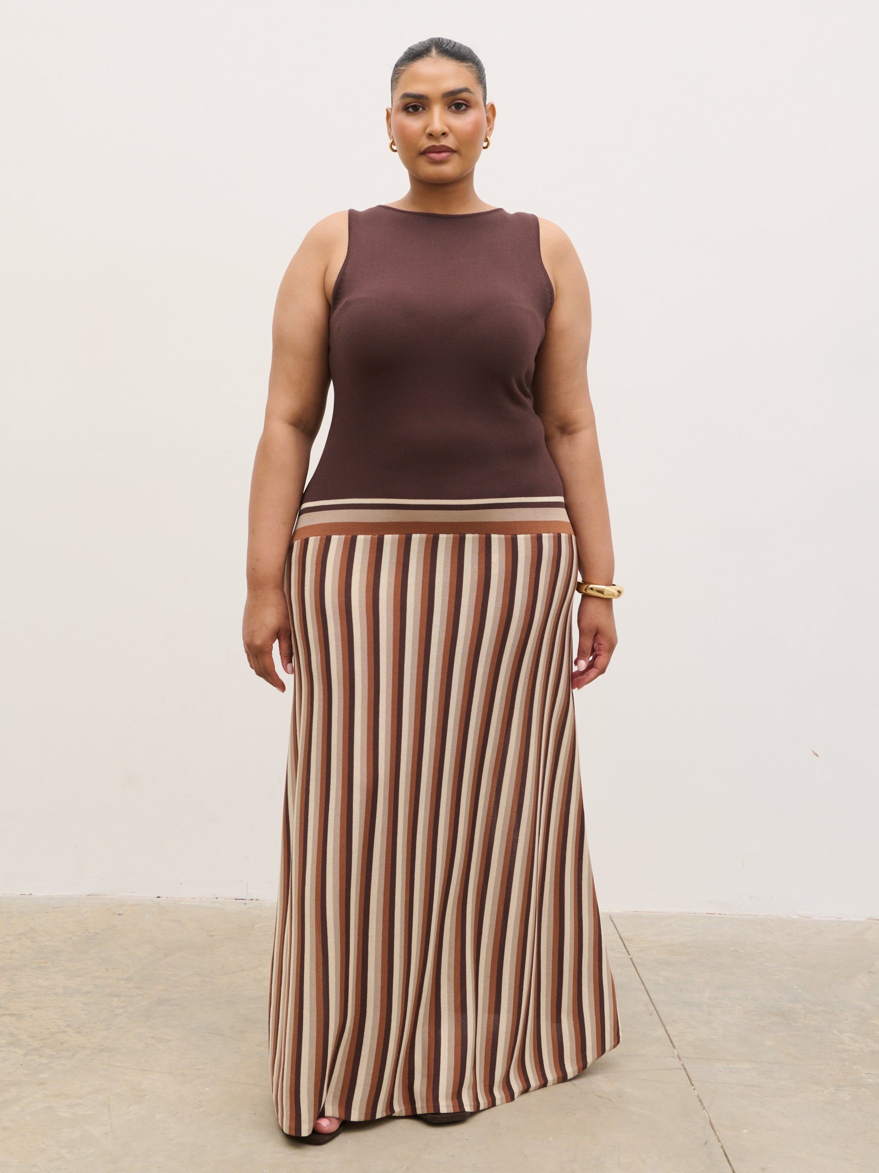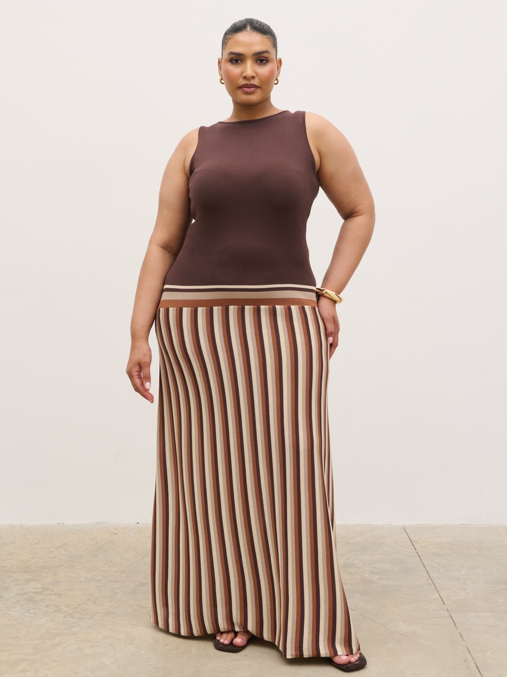 Crafted from a soft, stretch-knit fabric, the Phoebe Slash Neck Stripe Knit Maxi Dress in Brown has a body-skimming silhouette featuring a clean slash neckline and a fitted bodice that falls into a fluid maxi-length skirt. Vertical stripe detailing elongates the frame, adding a modern, flattering finish.