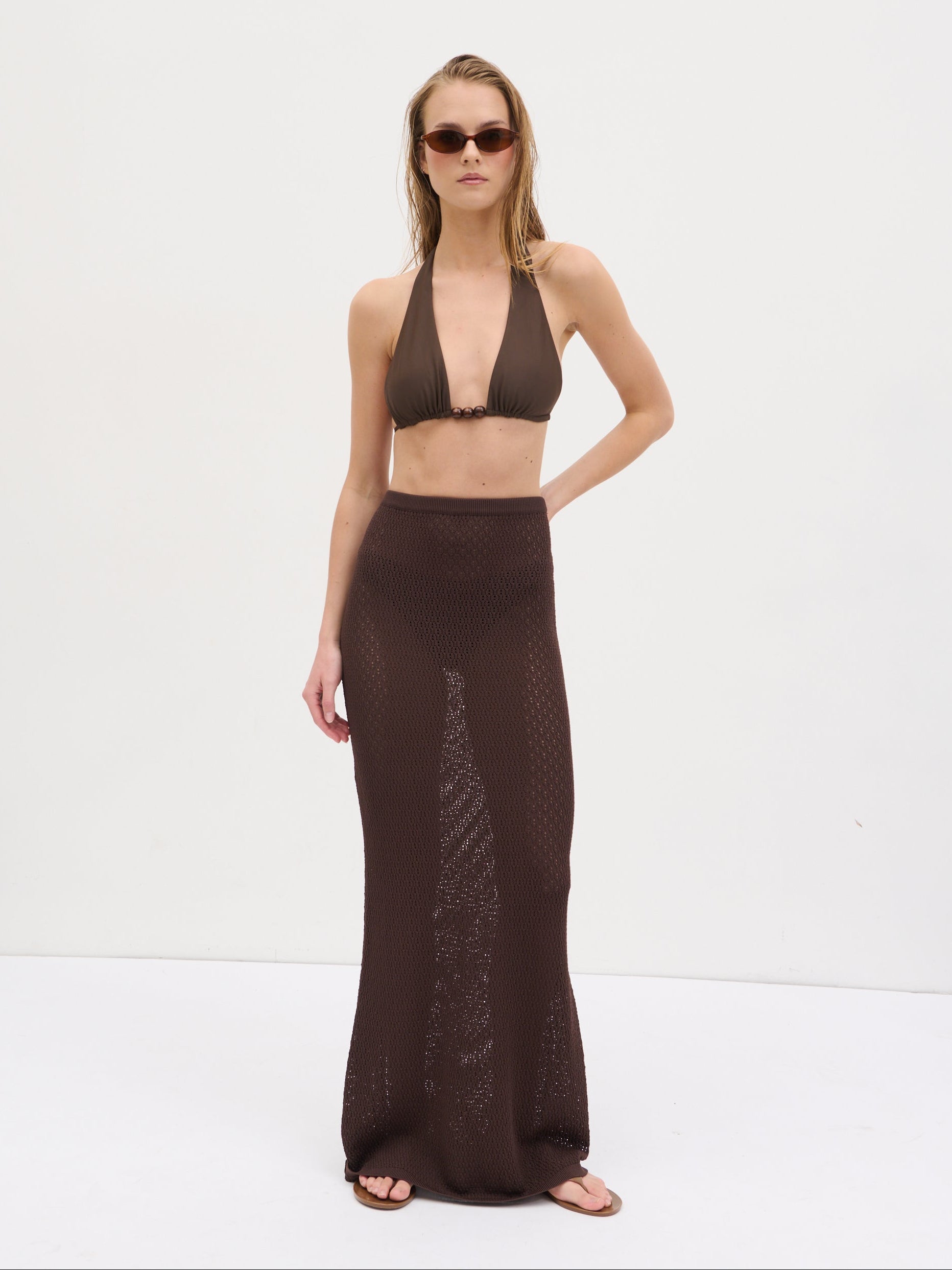 Part of our Resort Collection, the Dani Knit Lace Maxi Skirt in Chocolate is created with easy, sun-ready styling in mind. Crafted from a soft, open-knit lace, it features a flattering high-rise fit with a comfortable elasticated waistband and a sleek, elongated silhouette that skims the body. The semi-sheer finish adds a subtle sense of texture and movement.