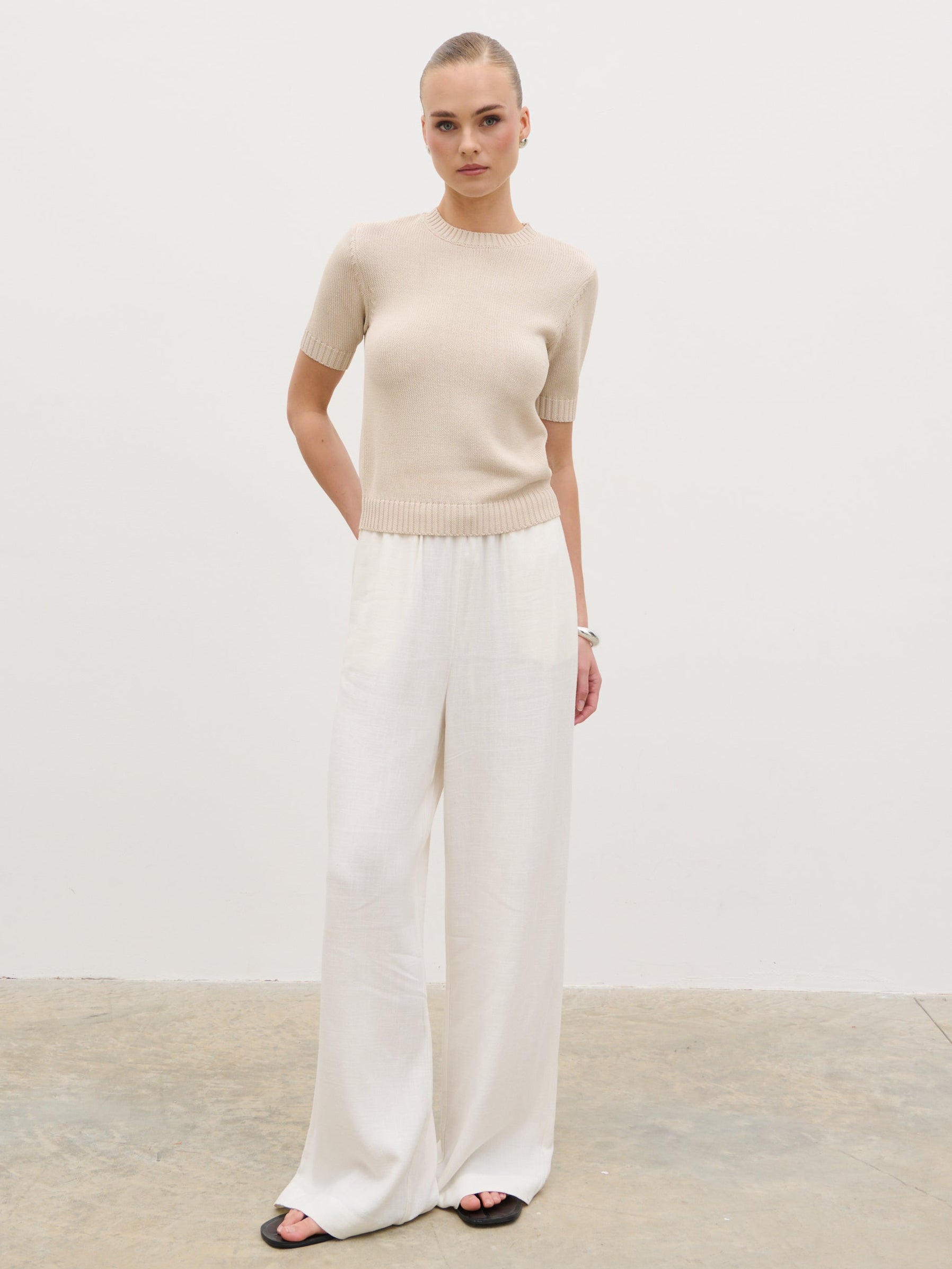 Elevate everyday essentials with the Fatima Knit Short Sleeve Top in Stone. Crafted from a soft, lightweight knit, this refined silhouette features a classic crew neckline and short sleeves for a clean, timeless finish. Ribbed trims at the cuffs and hem provide subtle structure, while the smooth, close fit offers a flattering, easy-to-style shape.