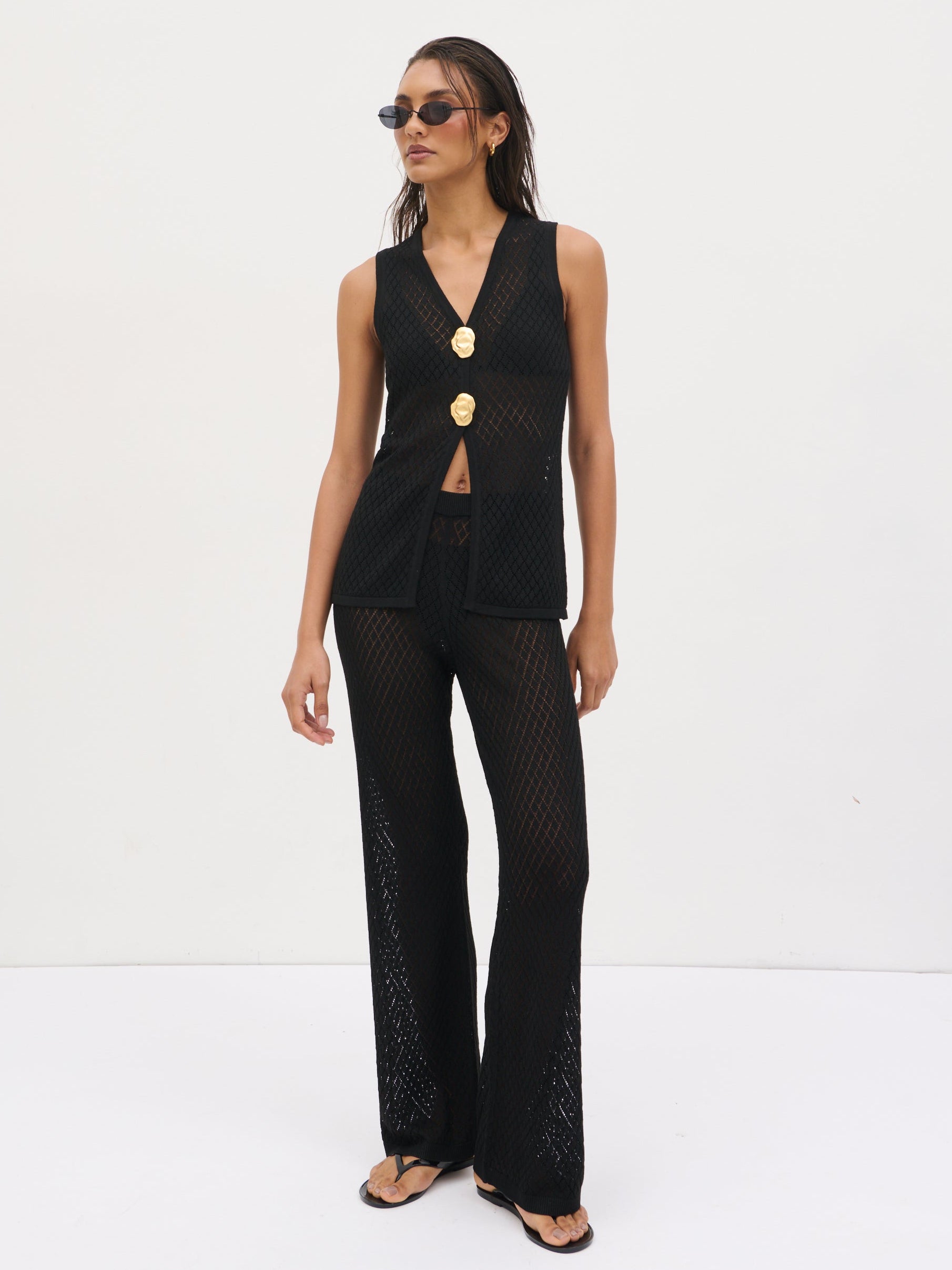 Part of our Resort Collection, the Imani Pointelle Knit Trousers in Black are designed for effortless, warm-weather styling. Crafted from a crochet-inspired pointelle knit, they feature a semi-sheer finish with a soft elasticated waistband and a relaxed straight-leg silhouette for all-day comfort. The open-knit texture adds subtle detail while keeping the look breathable and easy to wear.