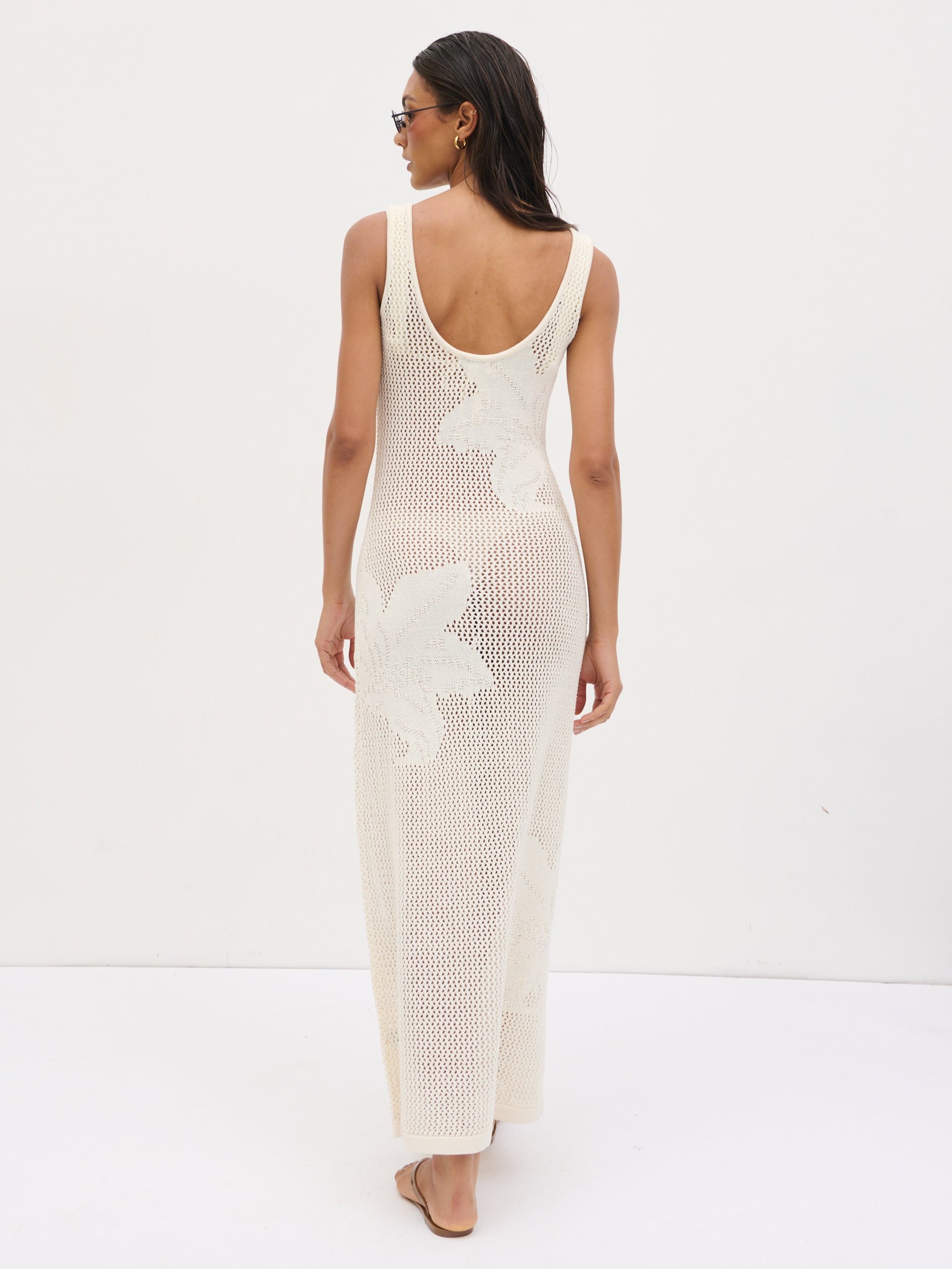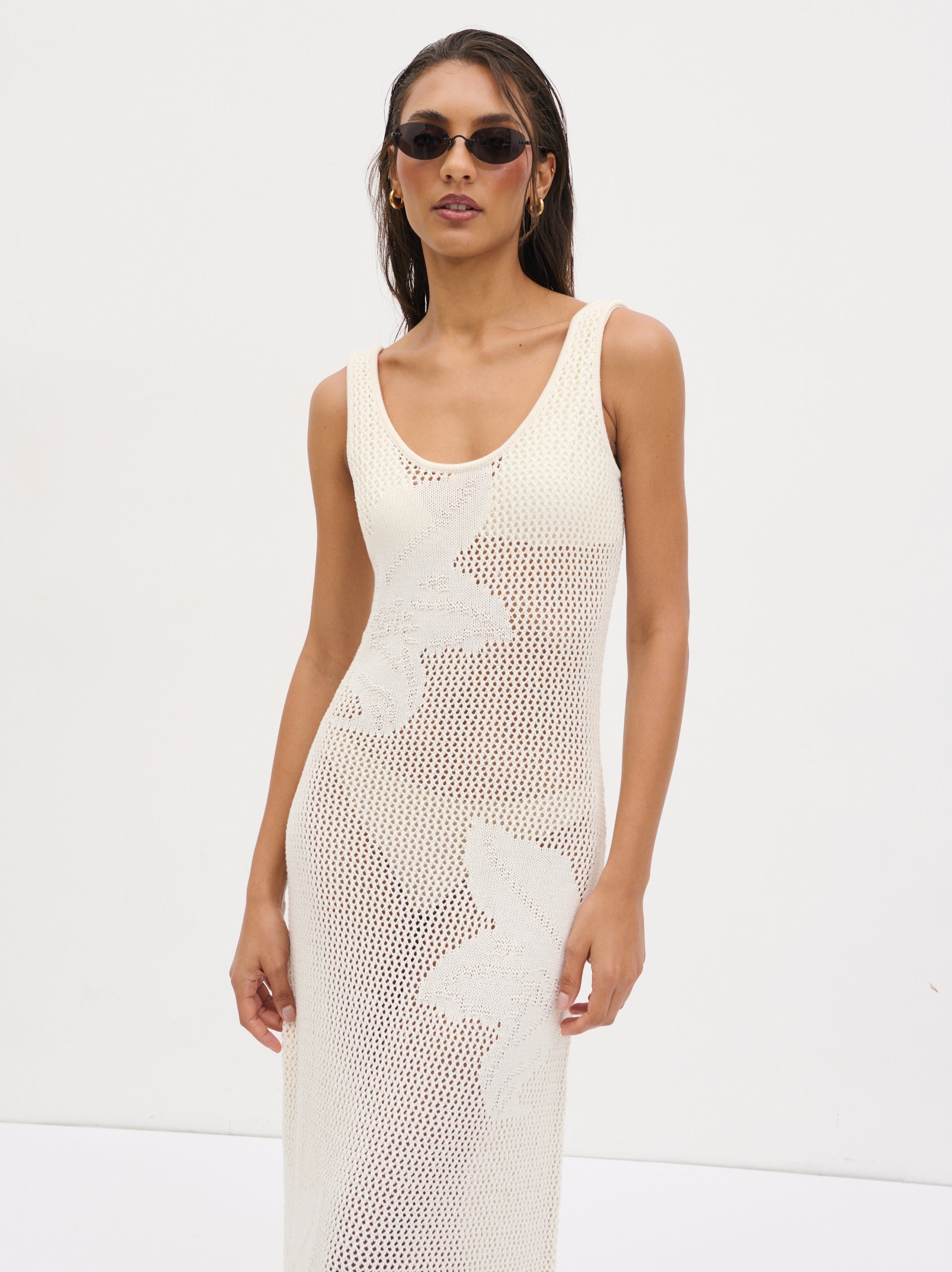 The Kailani Floral Openwork Knit Dress in Cream embodies a soft, feminine approach to warm-weather dressing. Crafted from a lightweight crochet knit, the sleeveless silhouette gently contours the body, while delicate floral motifs are intricately woven throughout, adding subtle texture.