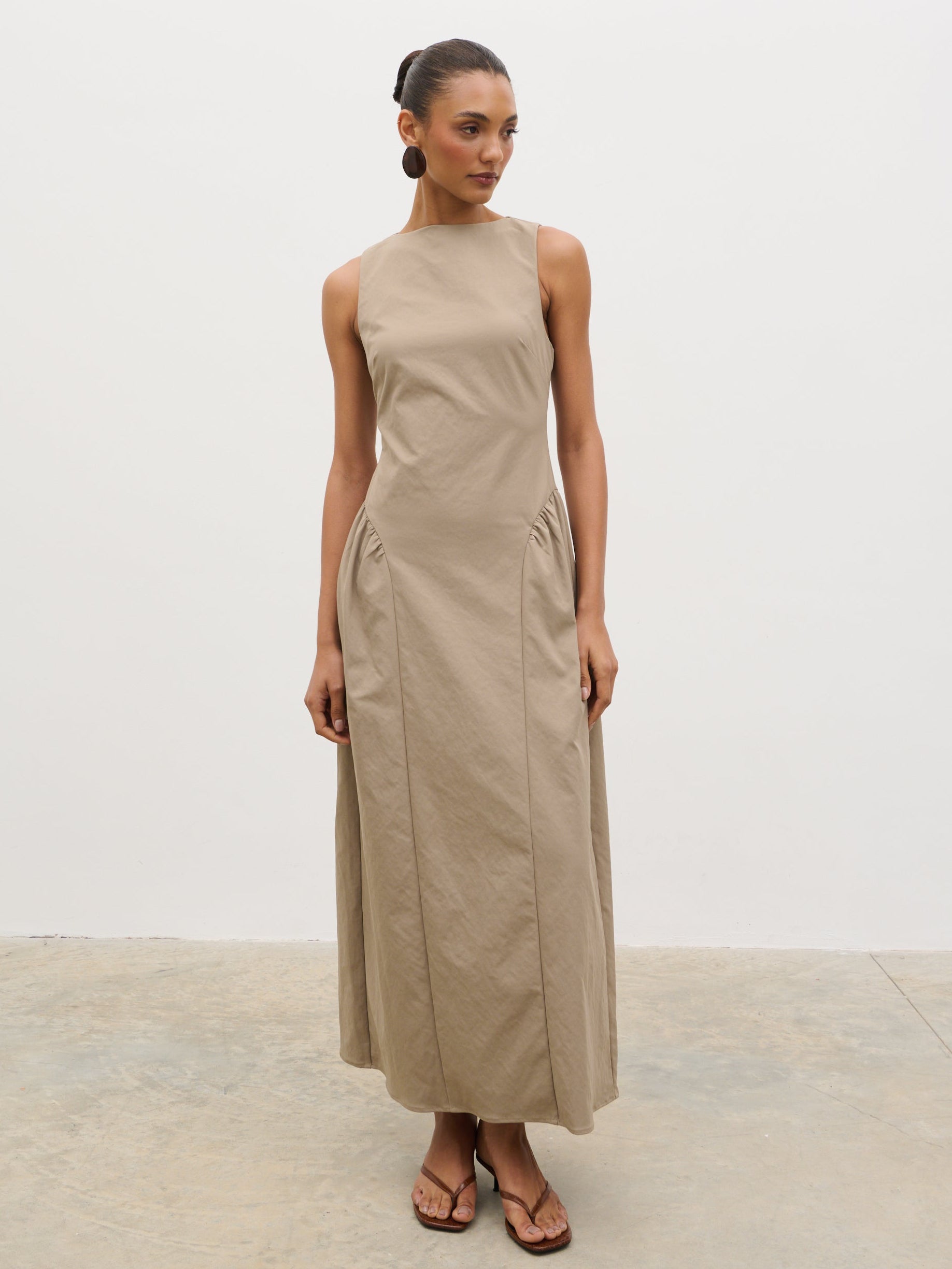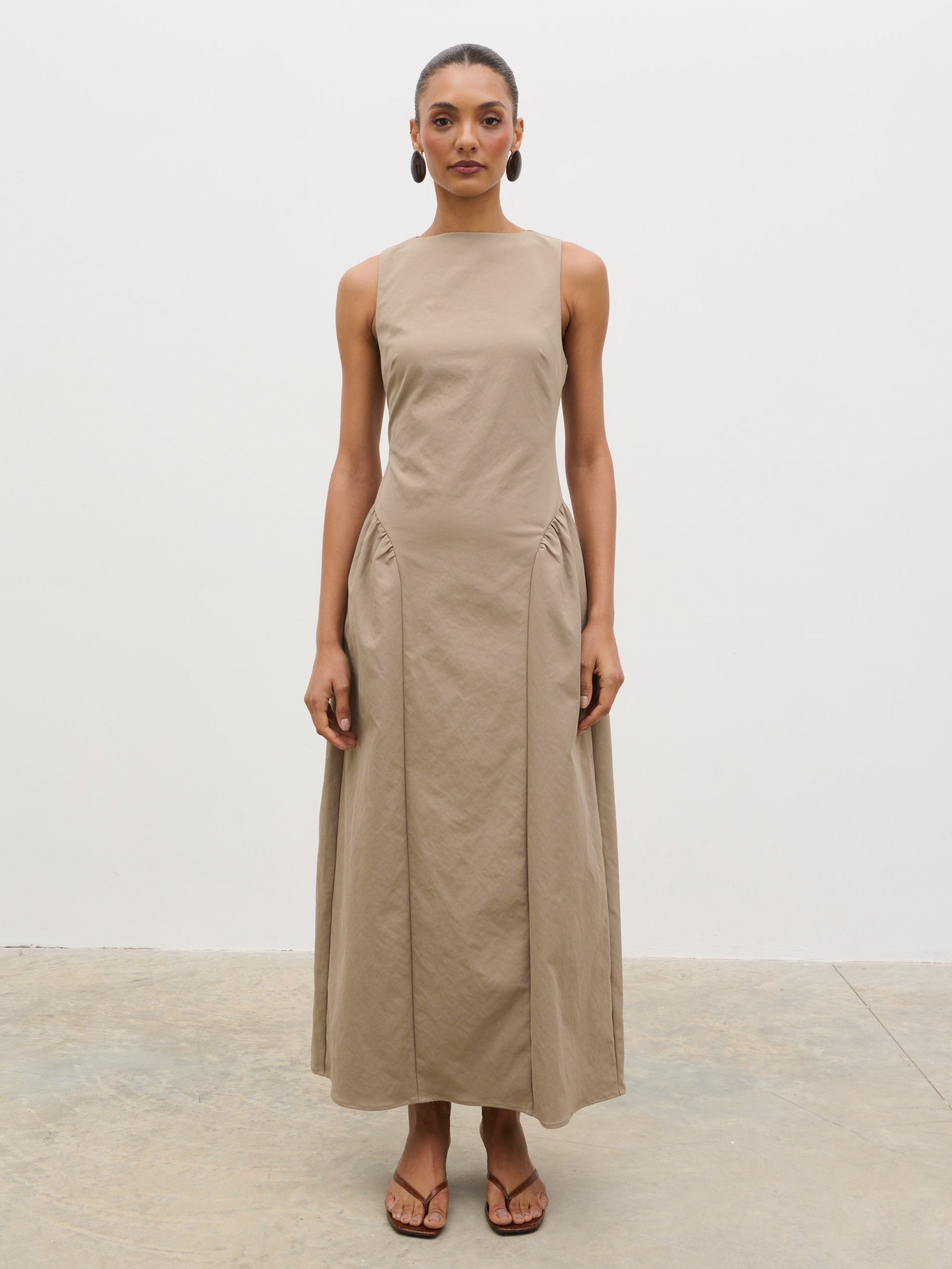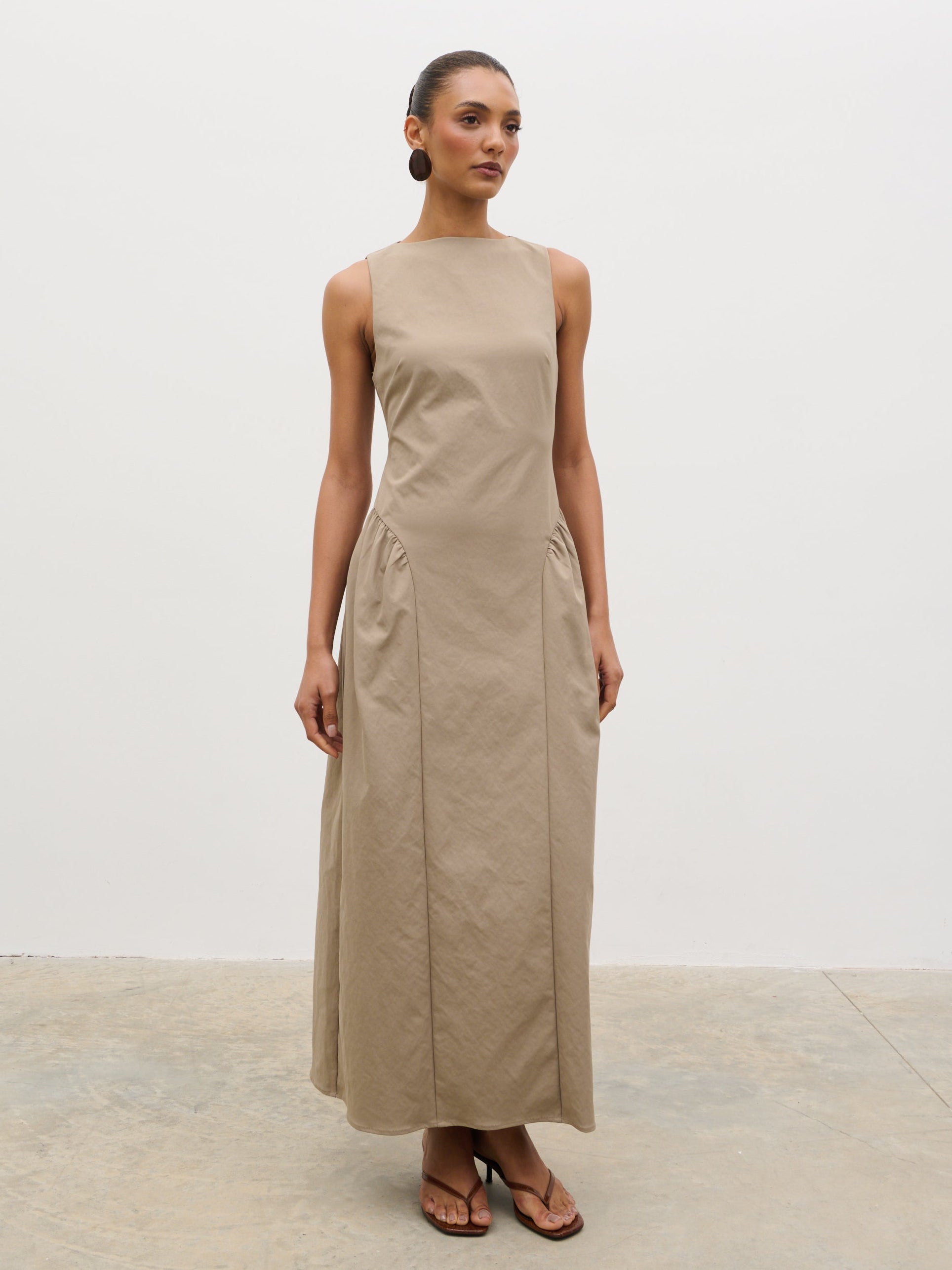 Designed for standout summer moments, the Sylvie Dress captures destination-ready elegance in a soft taupe. The clean slash neckline and softly structured bodice create a refined silhouette, falling into a fluid midaxi length that moves with ease.