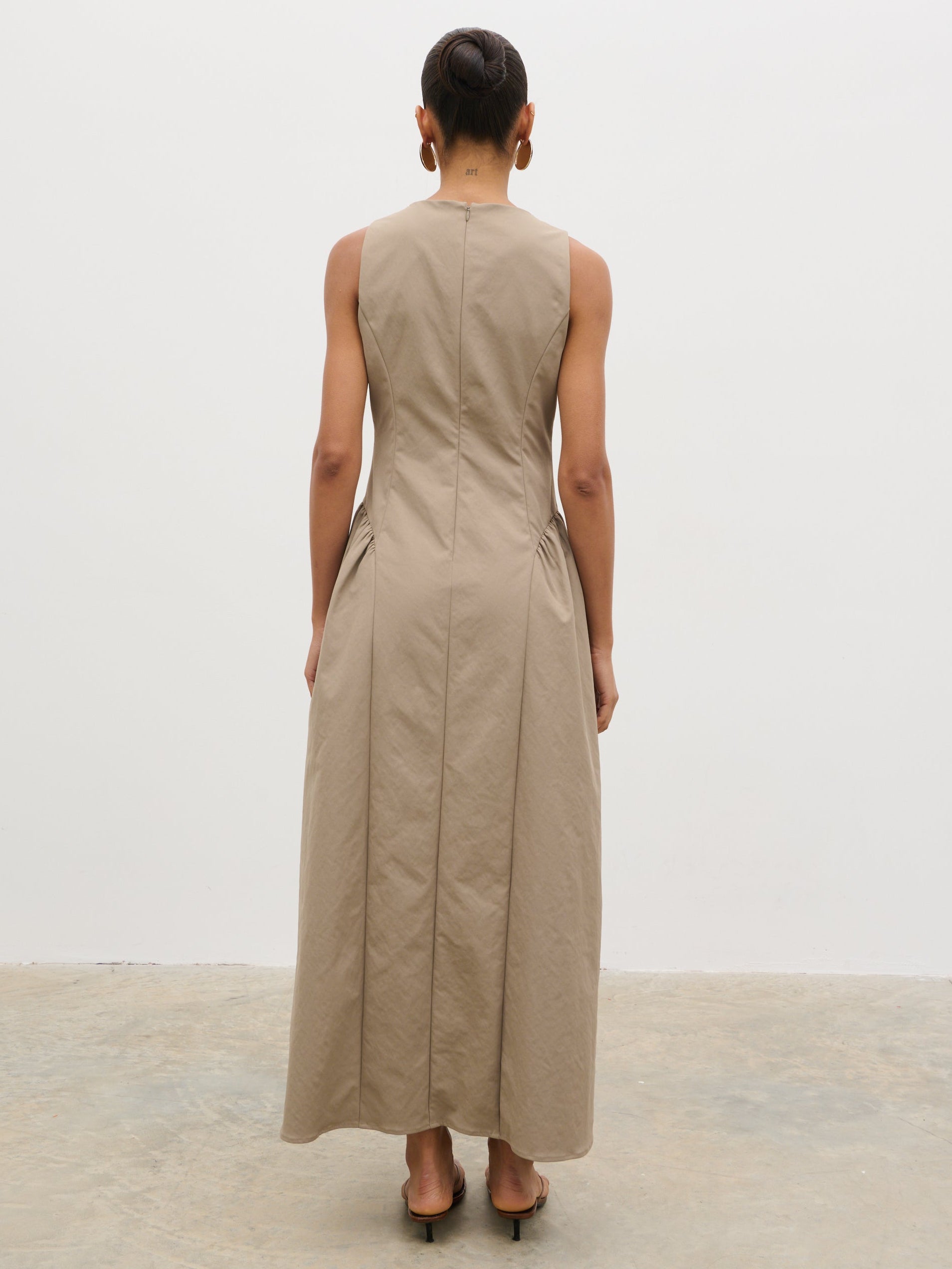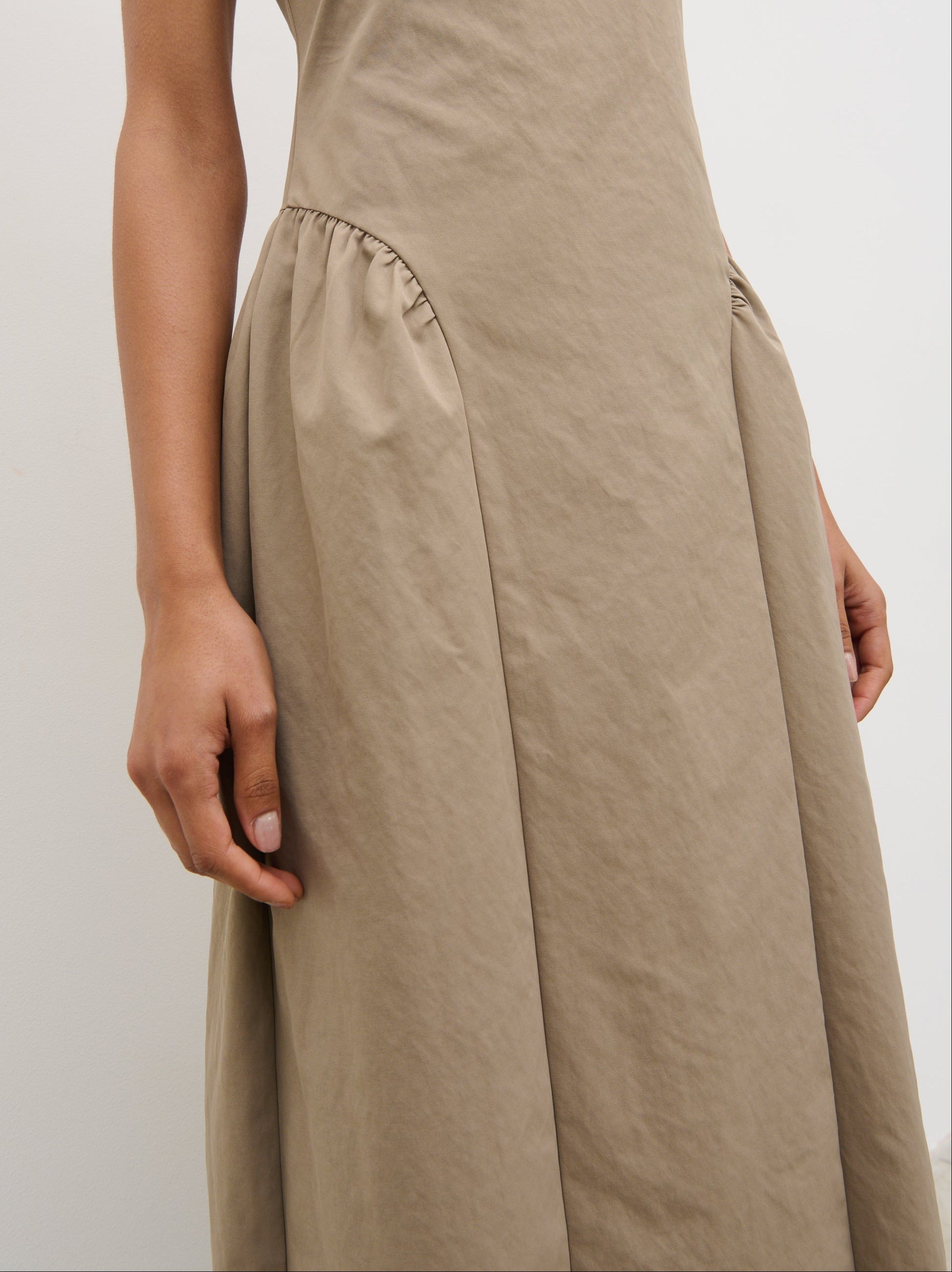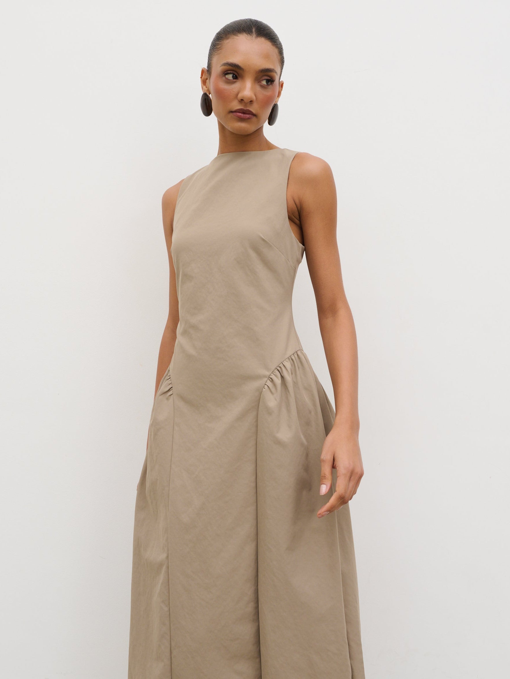 Designed for standout summer moments, the Sylvie Dress captures destination-ready elegance in a soft taupe. The clean slash neckline and softly structured bodice create a refined silhouette, falling into a fluid midaxi length that moves with ease.