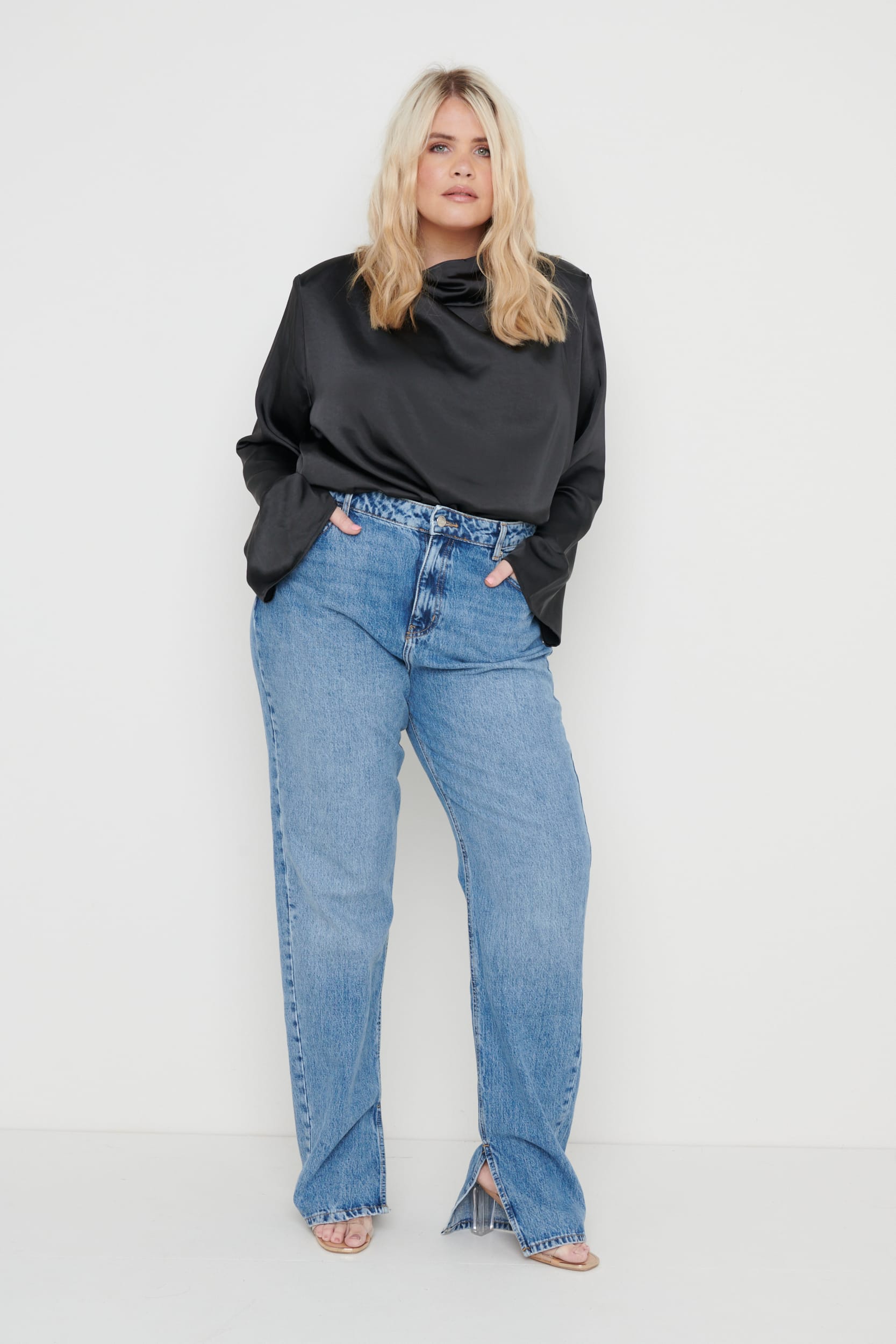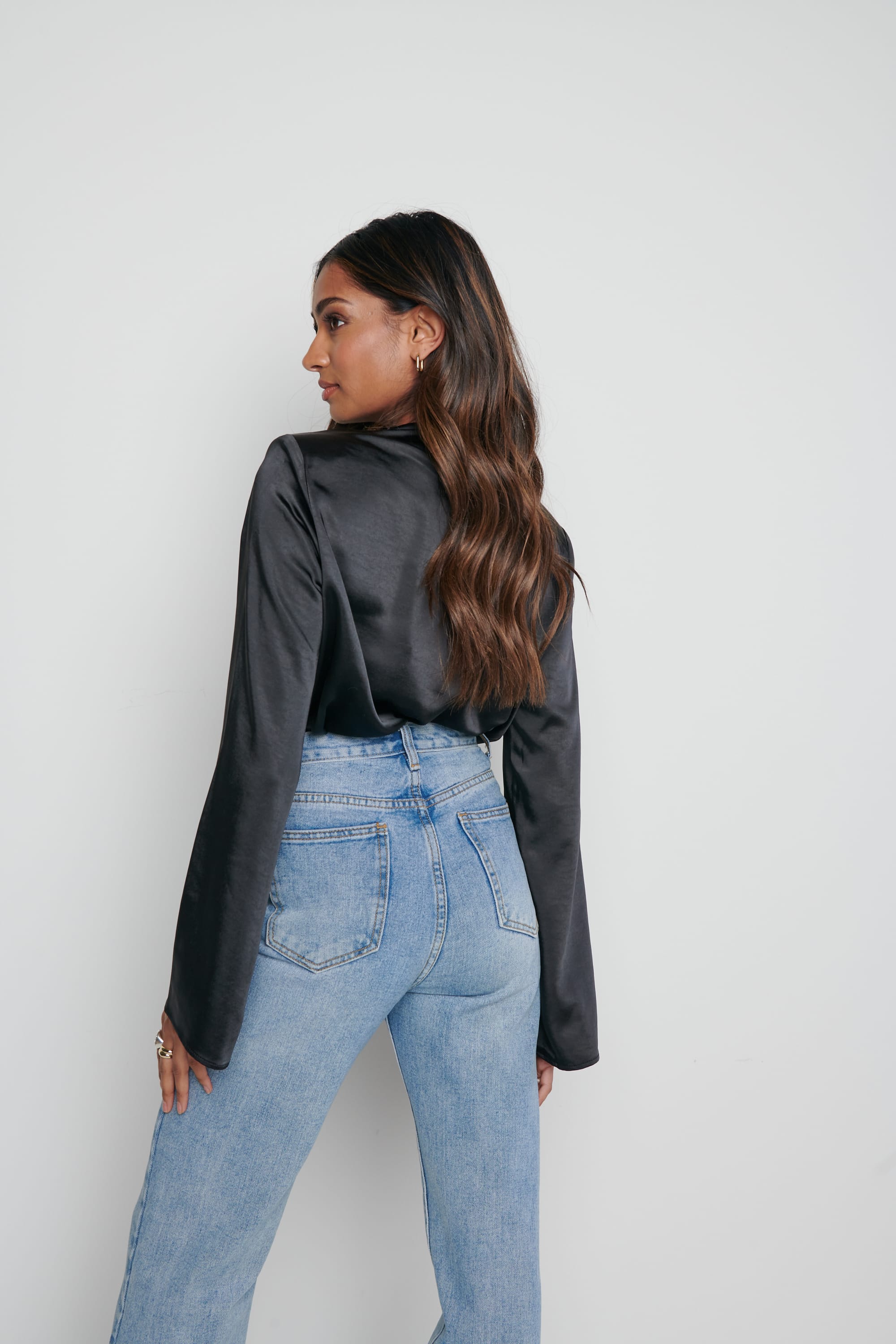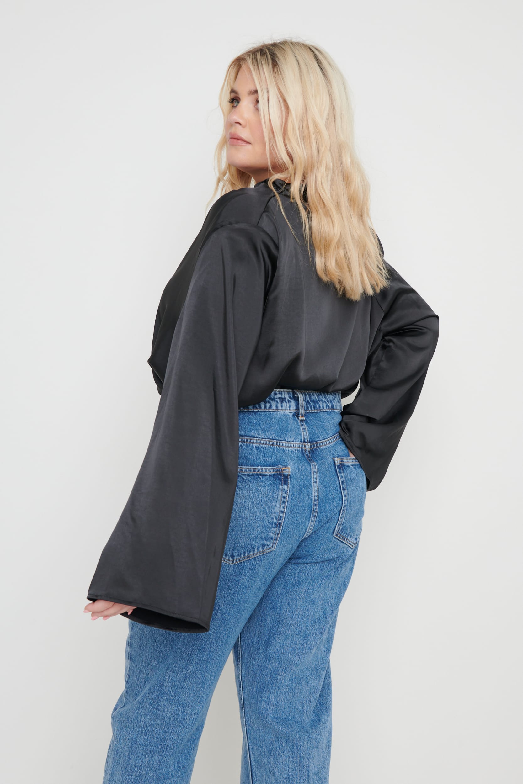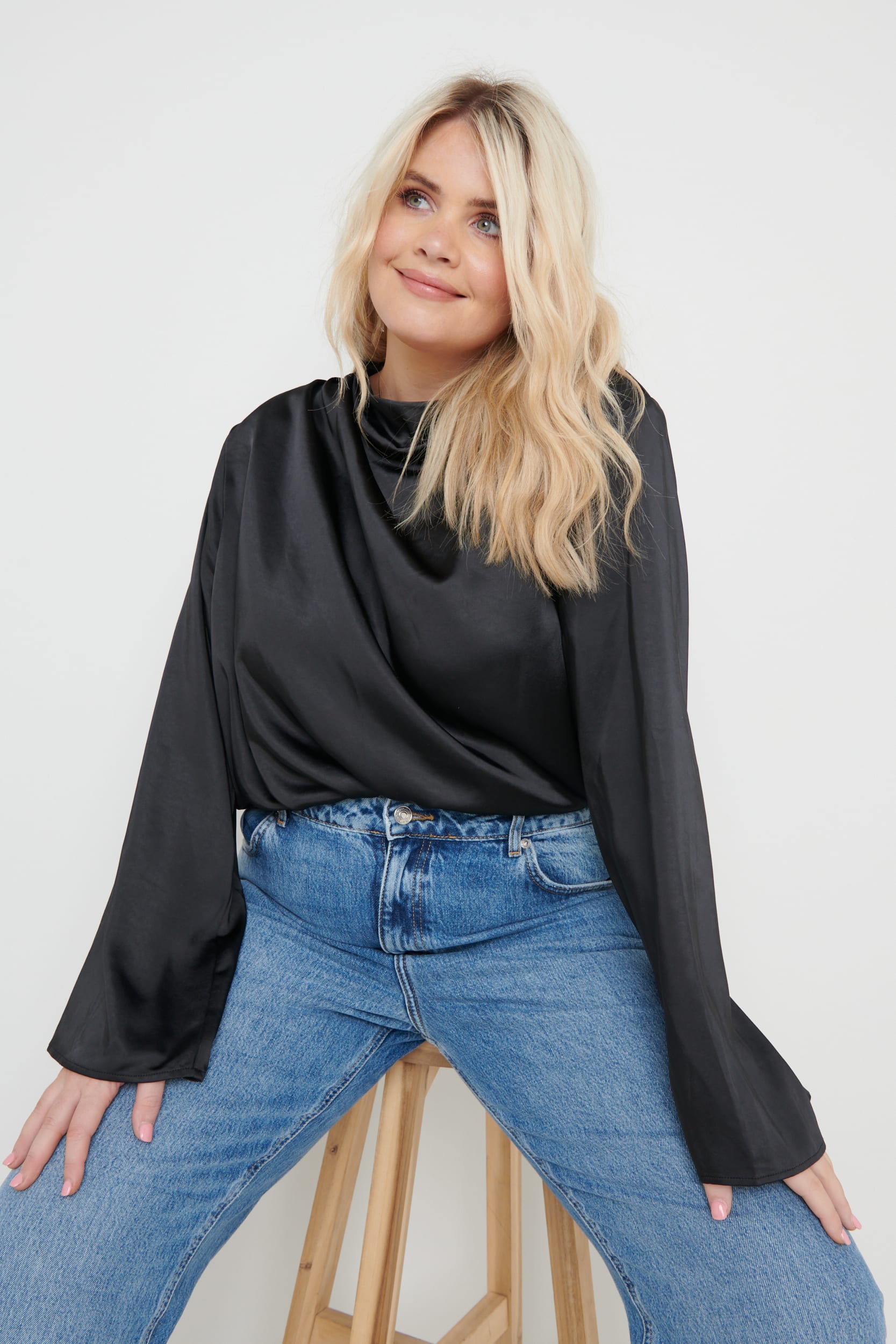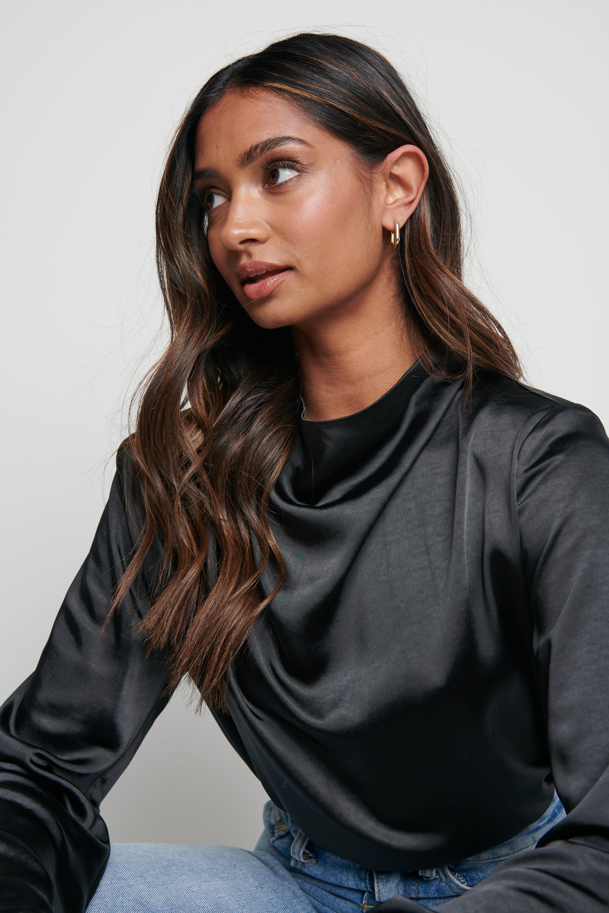 The Jayda is cut from glossy satin in an elegant silhouette that drapes beautifully at the neck. The silhouette is softly exaggerated with padded shoulders and draped cowl neck. Wear yours with your favourite jeans and heels or with trainers for a relaxed look.
